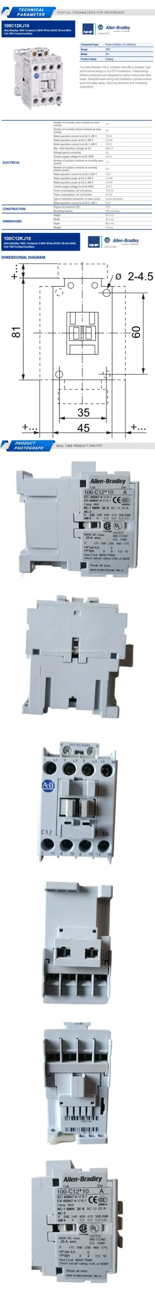 The Allen-Bradley 100-C12KJ10 is a 3-pole IEC contactor from the Bulletin 100-C series, designed for reliable switching of electrical loads, particularly motors. It is rated for 12 Amps (AC-3 at 400V) and features an electronically controlled 24V DC coil with a PLC interface, which allows for direct control from PLC outputs and offers reduced power consumption. This contactor includes one normally open (N.O.) front-mounted auxiliary contact for additional signaling or interlocking functions. Its compact design is suitable for both DIN rail and panel mounting, making it a versatile choice for various industrial control applications requiring efficient motor control or power switching.