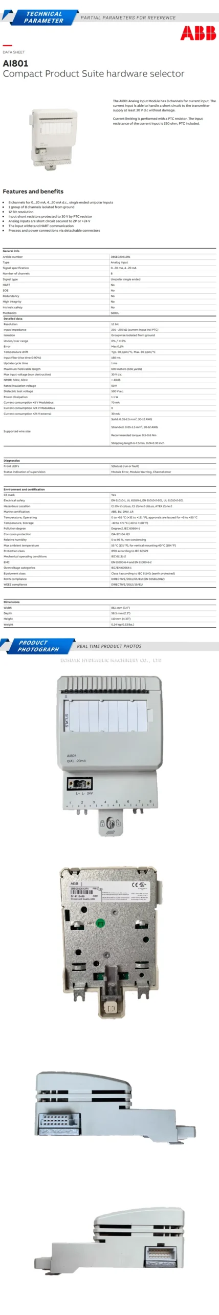 The ABB AI801 (3BSE020512R1) is an analog input module for the S800 I/O system. It features 8 individually configurable channels designed to measure current or voltage signals with high accuracy and resolution. This module is suitable for a wide range of industrial process control applications, providing reliable data acquisition from field devices. It supports HART pass-through communication on each channel, enabling seamless integration and diagnostics of HART-enabled transmitters and actuators.