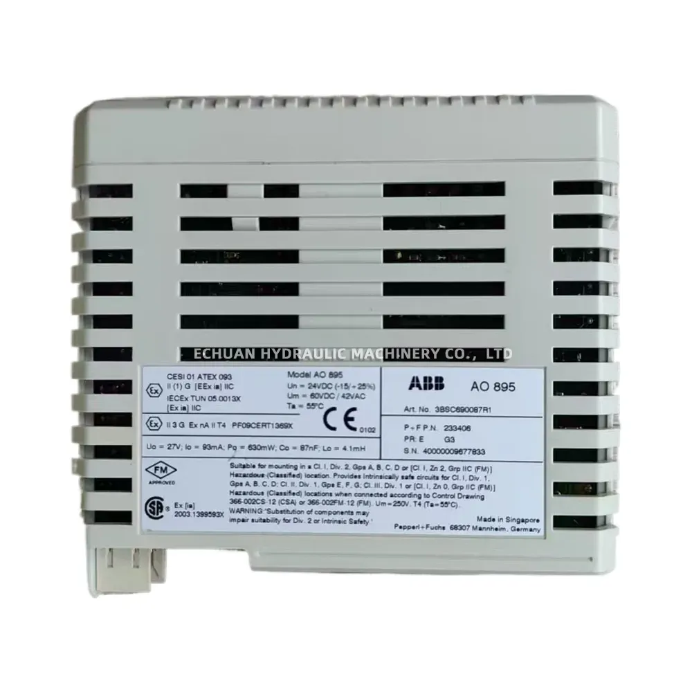 The ABB AO895 is a high-performance analog output module for the S800 I/O system, a comprehensive, distributed, and modular process I/O system. This module features eight individually isolated channels, each capable of providing a 0-20 mA or 4-20 mA current output. It is designed for controlling final control elements such as valves and actuators in demanding industrial environments. The AO895 supports HART pass-through communication, enabling seamless integration with smart field devices for configuration, monitoring, and diagnostics. It connects to the controller via the ModuleBus and requires a specific Module Termination Unit (MTU) for field signal termination.