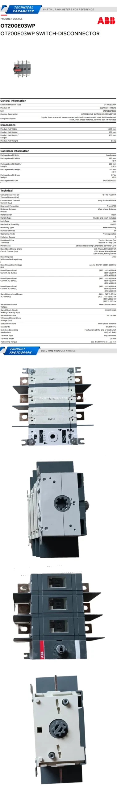The ABB OT200E03WP is a robust 3-pole enclosed switch disconnector designed for safe and reliable electrical isolation in a variety of industrial applications. It features front operation for ease of use and base mounting for secure installation. The switch is housed in a durable IP65-rated plastic enclosure, offering excellent protection against dust and water ingress, making it suitable for demanding environments. This unit typically includes a pistol-type handle and shaft, ensuring convenient and secure operation. The OT200E03WP is commonly used as a main switch for machinery or for isolating sections of an electrical system during maintenance.