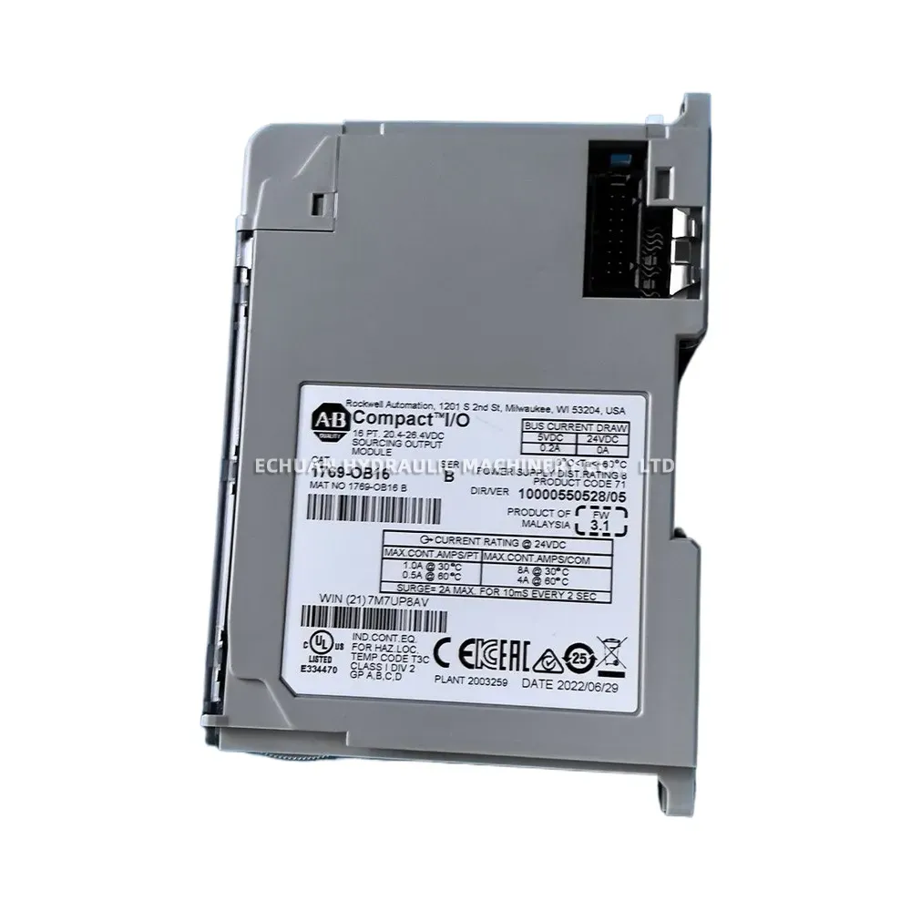 The Allen-Bradley 1769-OB16 is a CompactLogix 16-Point 24V DC Source Output Module designed for use with CompactLogix and MicroLogix 1500 controllers. This module provides sixteen (16) sourcing outputs, making it ideal for controlling a wide range of output devices such as relays, solenoids, contactors, and indicators in industrial automation systems. It offers a compact design, saving valuable panel space while delivering reliable performance and flexible configuration options for various application needs. The module is engineered for durability and seamless integration within the Rockwell Automation Logix platform.