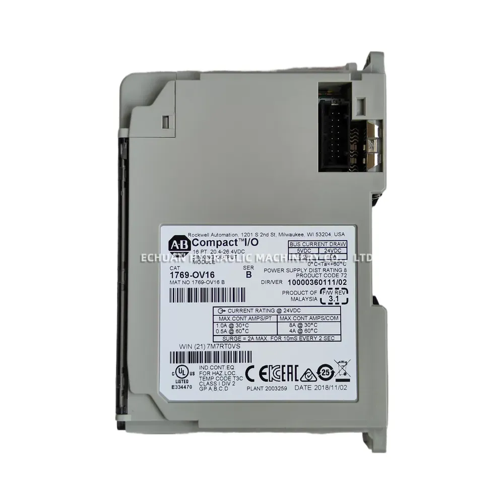 The Allen-Bradley 1769-OV16 is a CompactLogix 16-Point DC Sourcing Output Module designed for use in industrial control systems. As part of the 1769 Compact I/O platform, this module provides a high-density, cost-effective solution for controlling a wide range of output devices such as pilot lights, relays, and motor starters. It operates on a 24V DC voltage category and features sixteen sourcing outputs, making it a versatile component for applications requiring reliable digital control within a CompactLogix or MicroLogix 1500 system architecture.