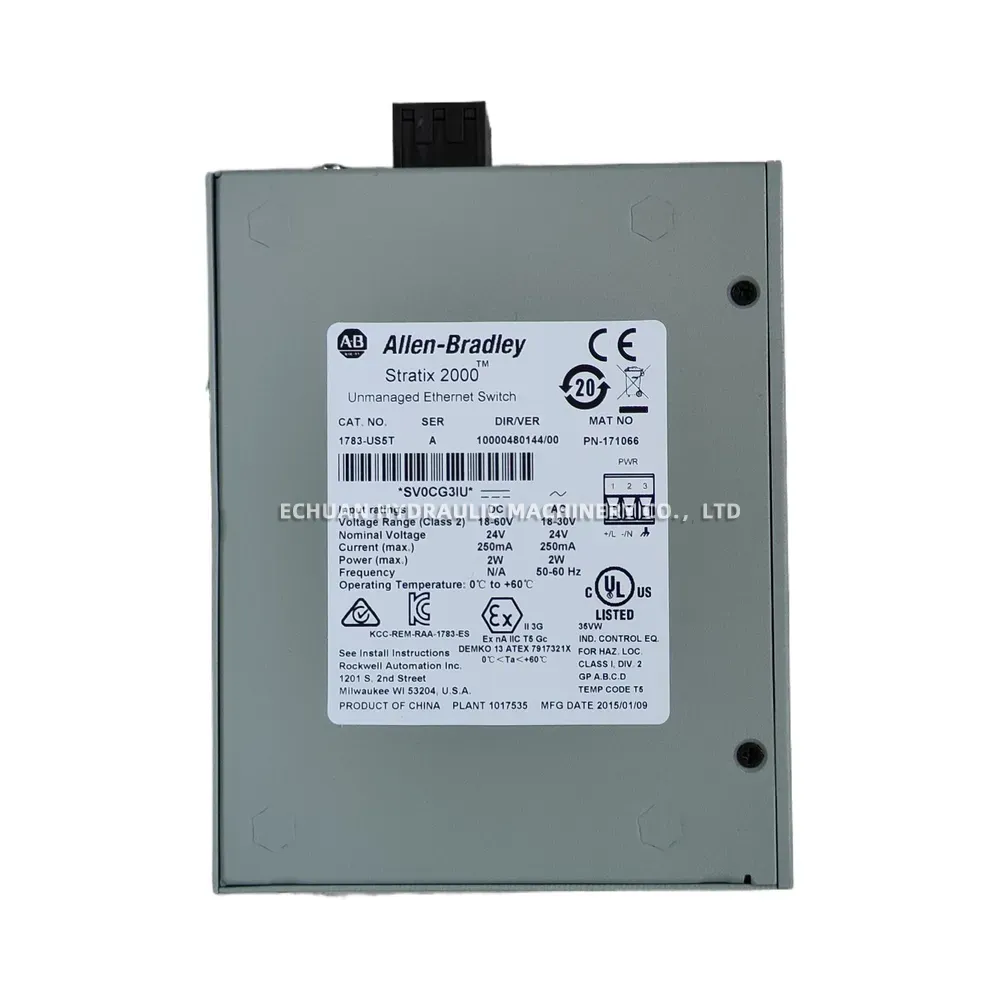 The Allen-Bradley 1783-US5T is a Stratix 2000 series unmanaged Ethernet switch, engineered for reliable performance in demanding industrial environments. This compact, 5-port switch provides a simple plug-and-play solution for expanding your network on the plant floor. Its rugged design, DIN rail mounting capability, and support for 10/100 Mbps speeds make it an ideal choice for connecting PLCs, HMIs, and other automation devices. The 1783-US5T requires no configuration, allowing for quick and effortless installation to get your network up and running with minimal downtime.