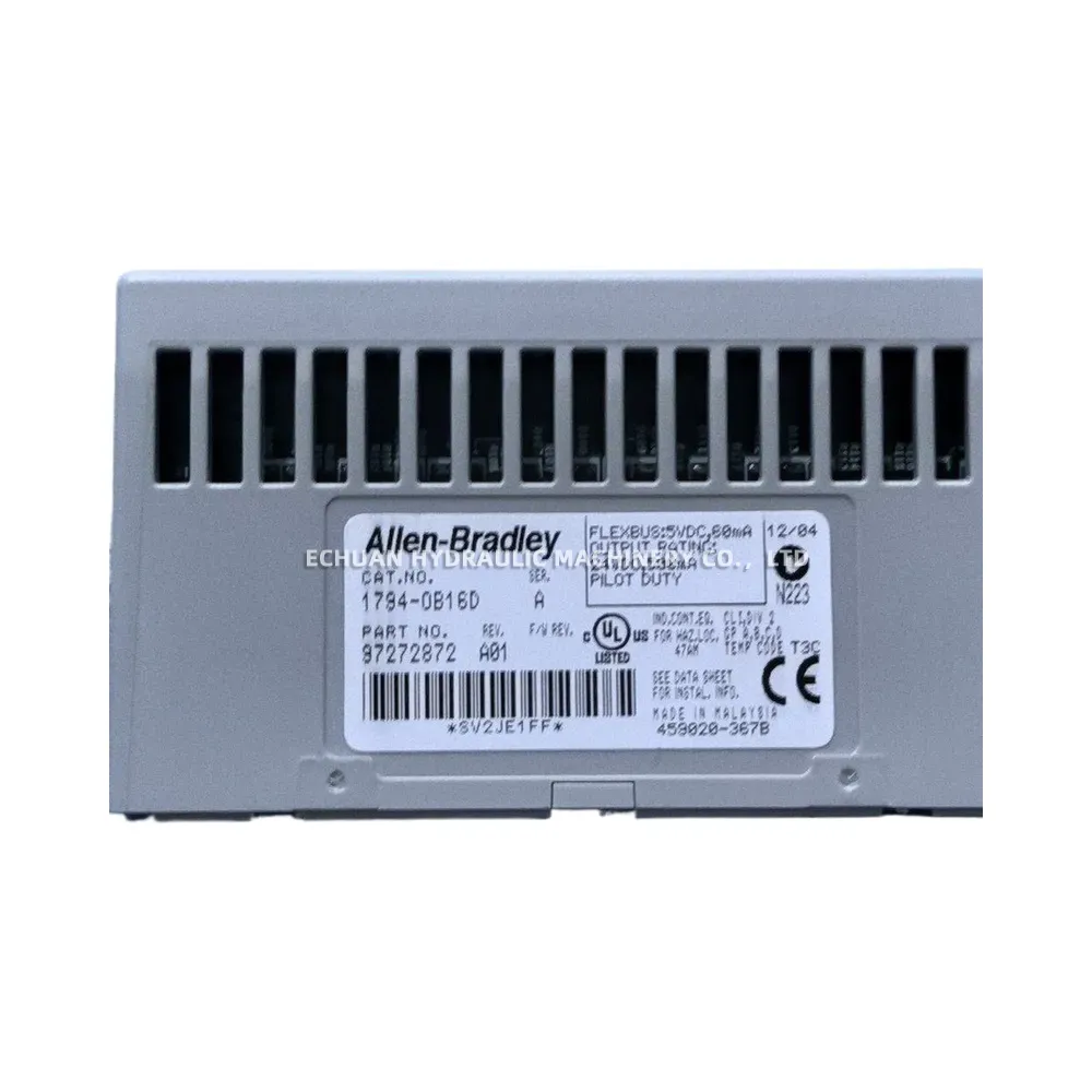 The Allen-Bradley 1794-OB16D is a FLEX I/O 24V DC Sourcing Output Module designed for high-performance industrial control systems. It features sixteen sourcing-type digital outputs, providing reliable control for a wide range of actuators and devices. A key feature of this module is its advanced diagnostics, which can detect and report conditions such as open wire and short circuits for each individual output point. This capability significantly reduces troubleshooting time and enhances system reliability. The module is designed to be mounted on a 1794-TB3 or 1794-TB3S terminal base unit, integrating seamlessly into the modular FLEX I/O platform, which allows for flexible and scalable automation solutions.