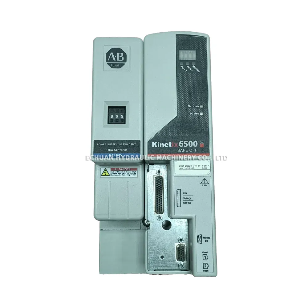 The Allen-Bradley 2094-BC02-M02-M is an Integrated Axis Module (IAM) from the Kinetix 6000 Multi-axis Servo Drive family. This module combines both inverter and converter functions into a single, compact unit, optimizing panel space and simplifying system architecture. Designed for high-performance motion control applications, it operates on a 460V AC input and delivers a continuous power output of 7.5 kW. The 2094-BC02-M02-M features a SERCOS interface for seamless integration into Allen-Bradley control systems and includes a built-in Safe Torque-Off (STO) feature, enhancing machine safety without the need for extra components. It is an ideal solution for complex, multi-axis applications requiring precise control and high dynamic response.