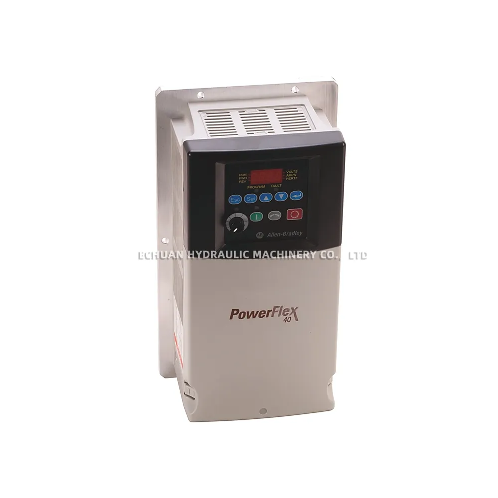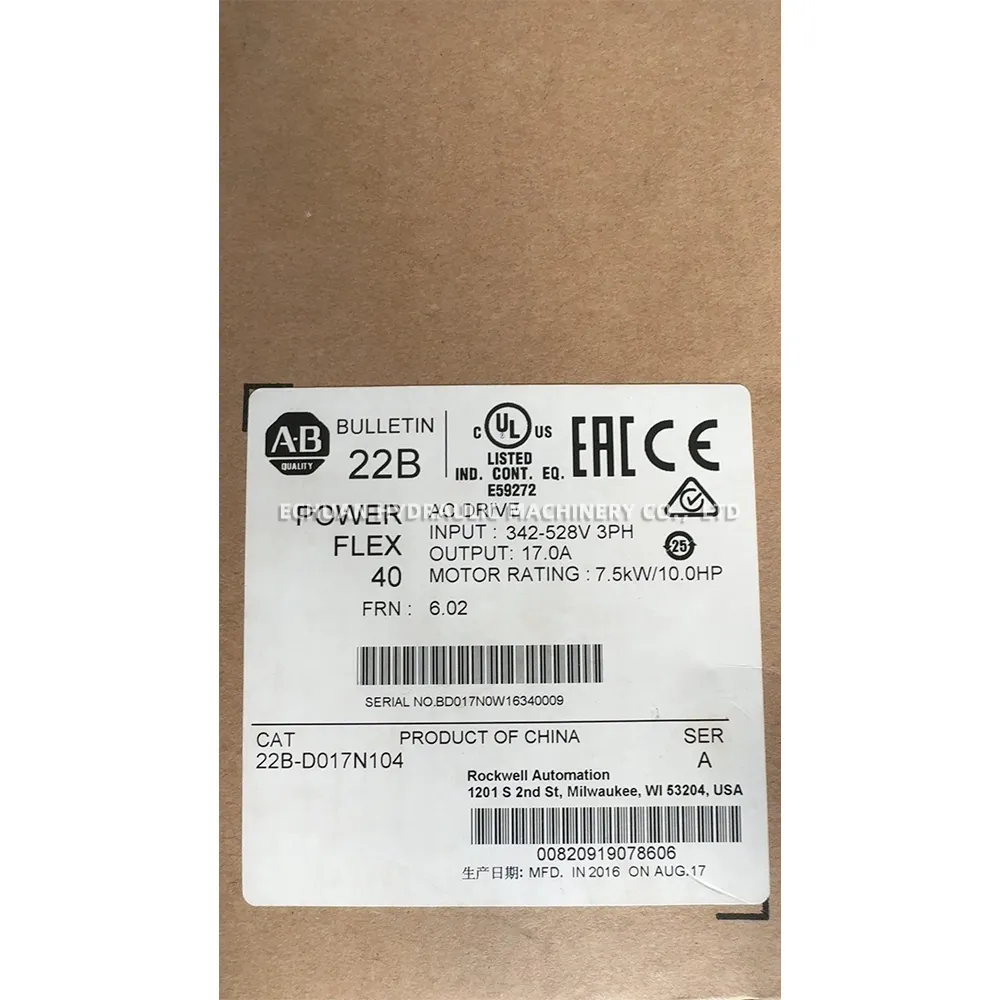 Allen-Bradley 22B-D017N104 PowerFlex 40 AC Drive, 7.5 kW (10 HP), 480V 3-Phase input. Features Sensorless Vector Control, integral RS-485 communication, and a built-in brake IGBT for dynamic braking applications.