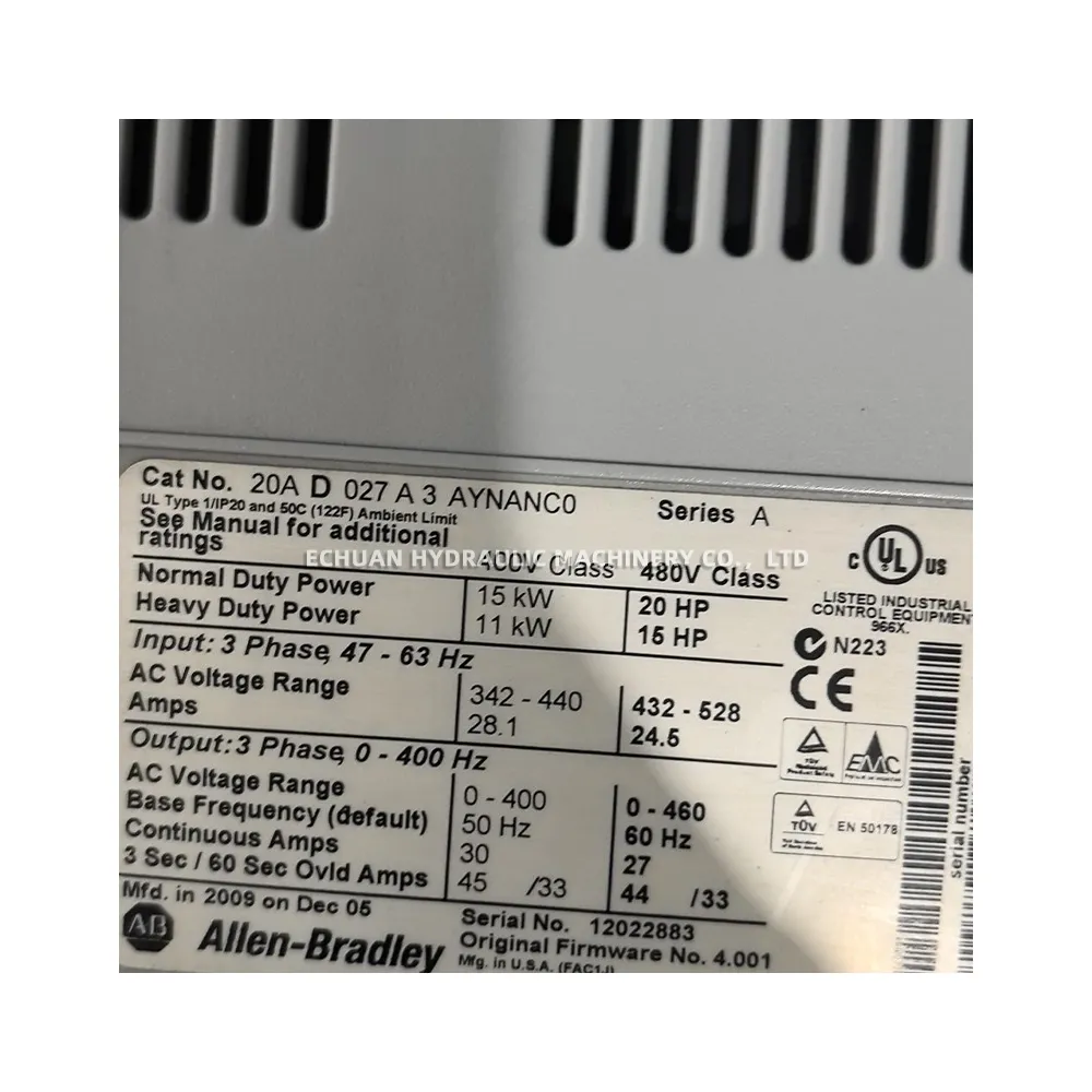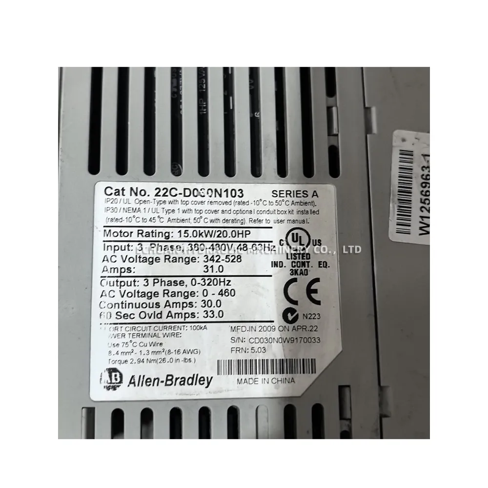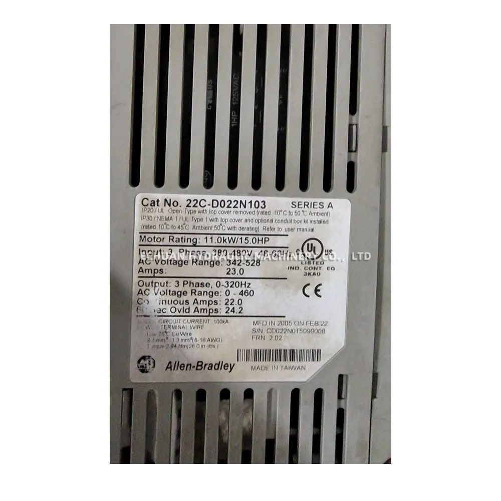 The Allen-Bradley 22C-D022N103 is a PowerFlex 400 AC Drive, engineered for flexibility, space-saving design, and ease of use. This drive is specifically optimized for commercial and industrial fan and pump applications. It features Sensorless Vector Control for exceptional motor speed regulation and torque response. With an integral RS-485 communication port, it can be easily integrated into a variety of control networks. The drive’s built-in PID controller and intuitive fixed keypad simplify setup and operation, making it a reliable solution for variable speed motor control.