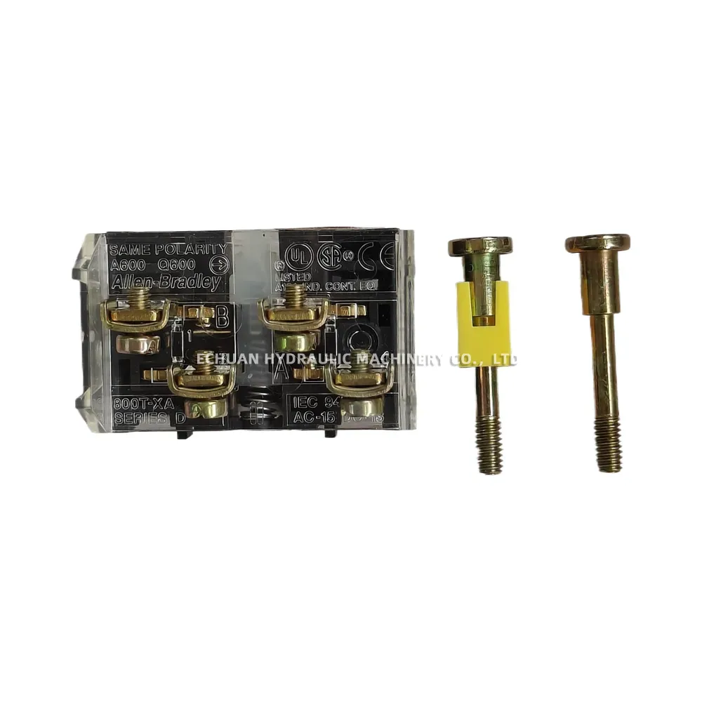 The Allen-Bradley 800T-XA is a heavy-duty, standard contact block designed for use with the Bulletin 800T and 800H series of 30.5 mm push buttons, selector switches, and pilot devices. This component provides a reliable electrical interface, featuring one normally open (N.O.) and one normally closed (N.C.) contact in a single, compact unit. Built for demanding industrial environments, it ensures long-lasting performance and secure connections thanks to its robust construction and pressure plate screw terminals. It is a fundamental building block for creating custom control stations and panels that require durability and operational integrity.