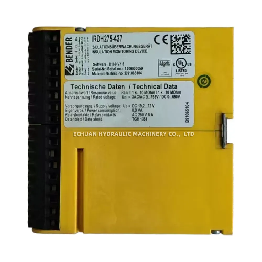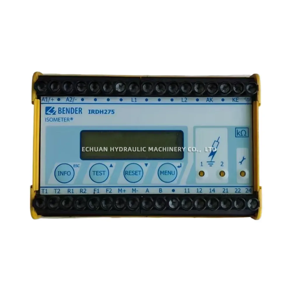 The Bender ISOMETER® IRDH275-427 is a state-of-the-art insulation monitoring device designed for unearthed AC, AC/DC, and DC power systems (IT systems). It continuously monitors the insulation resistance of a system to ground, providing early warnings of insulation faults before they can lead to critical failures or safety hazards. Utilizing the patented AMPPlus measurement principle, this device is particularly well-suited for modern, complex systems that include frequency converters, DC drives, and high leakage capacitances. The IRDH275-427 features a high-resolution graphic LC display for easy visualization of measured values, device parameters, and system status, ensuring enhanced operational safety and system availability.