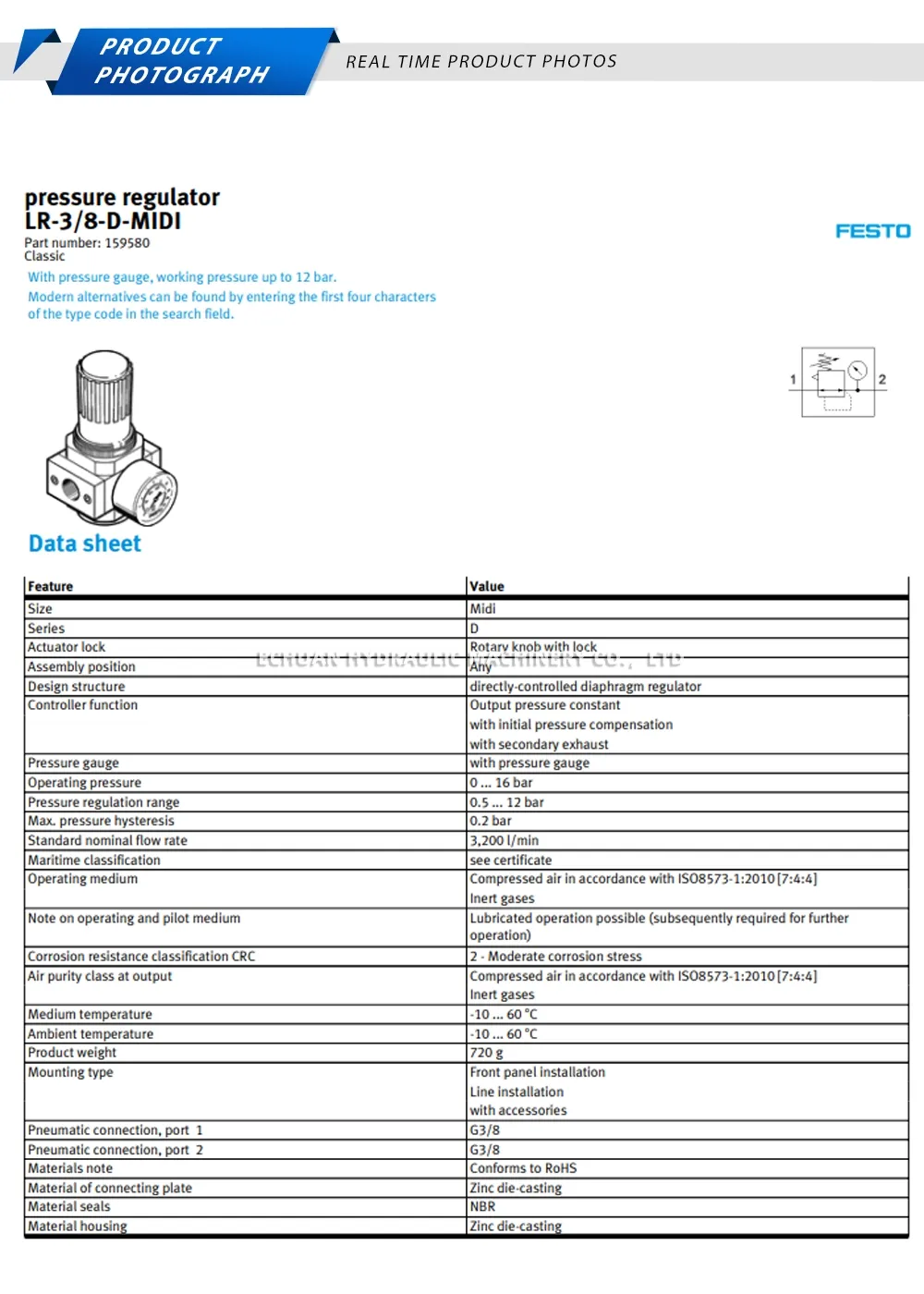 The Festo LR-3/8-D-MIDI is a high-performance pressure regulator from the D-series, designed for precise control of compressed air in standard pneumatic applications. This direct-diaphragm regulator ensures a constant output pressure regardless of fluctuations in the input pressure. It features a lockable rotary knob for secure pressure setting and can be easily integrated into service unit combinations. Its robust zinc die-cast housing and versatile mounting options make it a reliable and flexible choice for industrial automation systems.