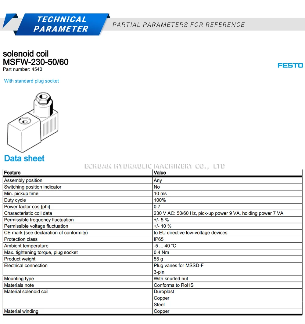 The Festo MSFW-230-50/60 is a standard solenoid coil designed for reliable actuation of various Festo solenoid valves, including series like VUVG, MEBH, MOEBH, VMPA, and CPA-SC. It operates on a 230V AC power supply at either 50 or 60 Hz. This coil is engineered for continuous operation (100% duty cycle) and features an electrical connection via a type A plug pattern as per EN 175301-803. When properly installed with a corresponding plug socket and seal, it achieves an IP65 protection rating, making it suitable for demanding industrial environments. The coil is mounted using a knurled nut and is constructed from durable materials to ensure longevity and consistent performance.