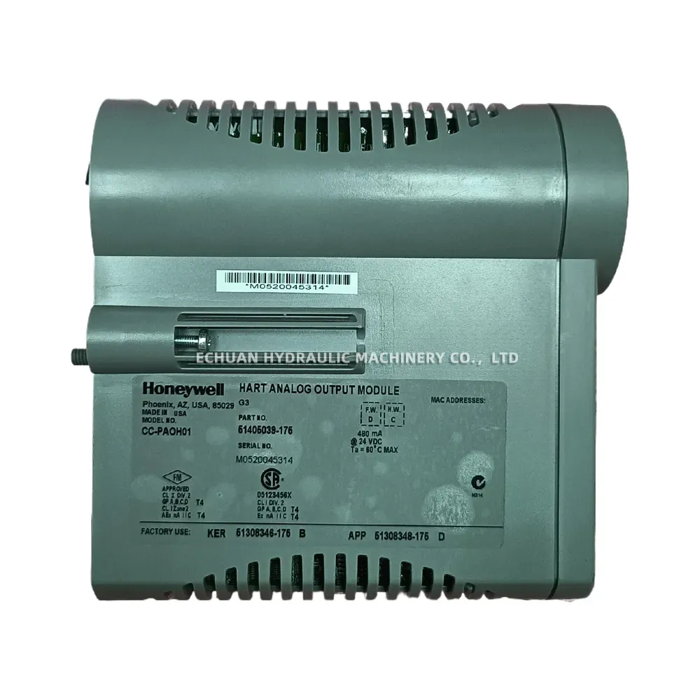 The Honeywell CC-PAOH01 is a high-performance HART Analog Output Module, part of the Experion Process Knowledge System (PKS) Series C I/O. This module is engineered to provide 16 channels of reliable and precise 4-20 mA analog outputs for controlling final control elements such as valves and actuators in industrial process applications. It fully supports the HART (Highway Addressable Remote Transducer) protocol, allowing for two-way digital communication over the analog wiring for device configuration, diagnostics, and status monitoring. Designed for seamless integration with the Honeywell C300 controller, the CC-PAOH01 supports redundant configurations to ensure maximum system availability and operational integrity.