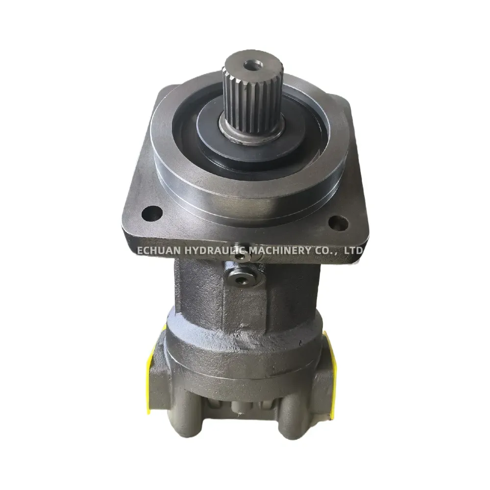 Heavy-duty industrial hydraulic motor featuring a durable cast iron housing, splined output shaft, and a 4-bolt square mounting flange. Designed for reliable torque transmission and seamless integration into industrial hydraulic drive systems.