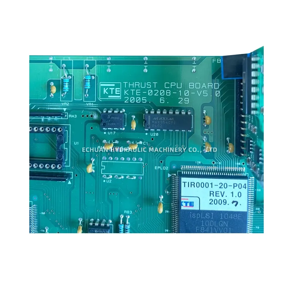 The KTE KTE-0208-10-V5.0 is a specialized Thrust CPU Board engineered for demanding industrial control systems. This board functions as a core processing unit, integrating high-quality components to ensure operational stability and precision. It is equipped with ispLSI 1048E Complex Programmable Logic Devices (CPLDs) and MAXIM MAX354CPE analog switches, which provide robust logic and signal routing capabilities. Designed as a direct replacement or spare part, this revision V5.0 board features multiple connector interfaces for seamless integration into its parent machinery, making it an essential component for system maintenance and repair.