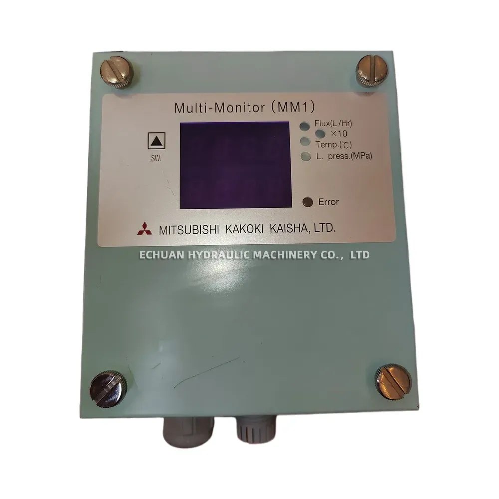 The MITSUBISHI KAKOKI KAISHA, LTD. MM1 is a compact and robust industrial multi-monitor designed for precise process control and supervision. It provides operators with a clear, at-a-glance view of three critical system parameters: Flux (flow rate), Temperature, and Line Pressure. The unit features a bright, dual 4-digit red LED display for numerical readouts, complemented by dedicated status indicator LEDs for each parameter and a general error alert. Engineered for reliability in demanding industrial environments, the MM1 serves as a crucial interface for maintaining operational efficiency and safety in various machinery and plant systems.