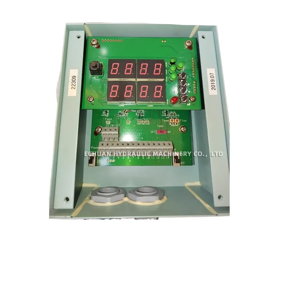 - Inputs: Terminal block connections for power, temperature (Temp), and flow (Flow) sensors