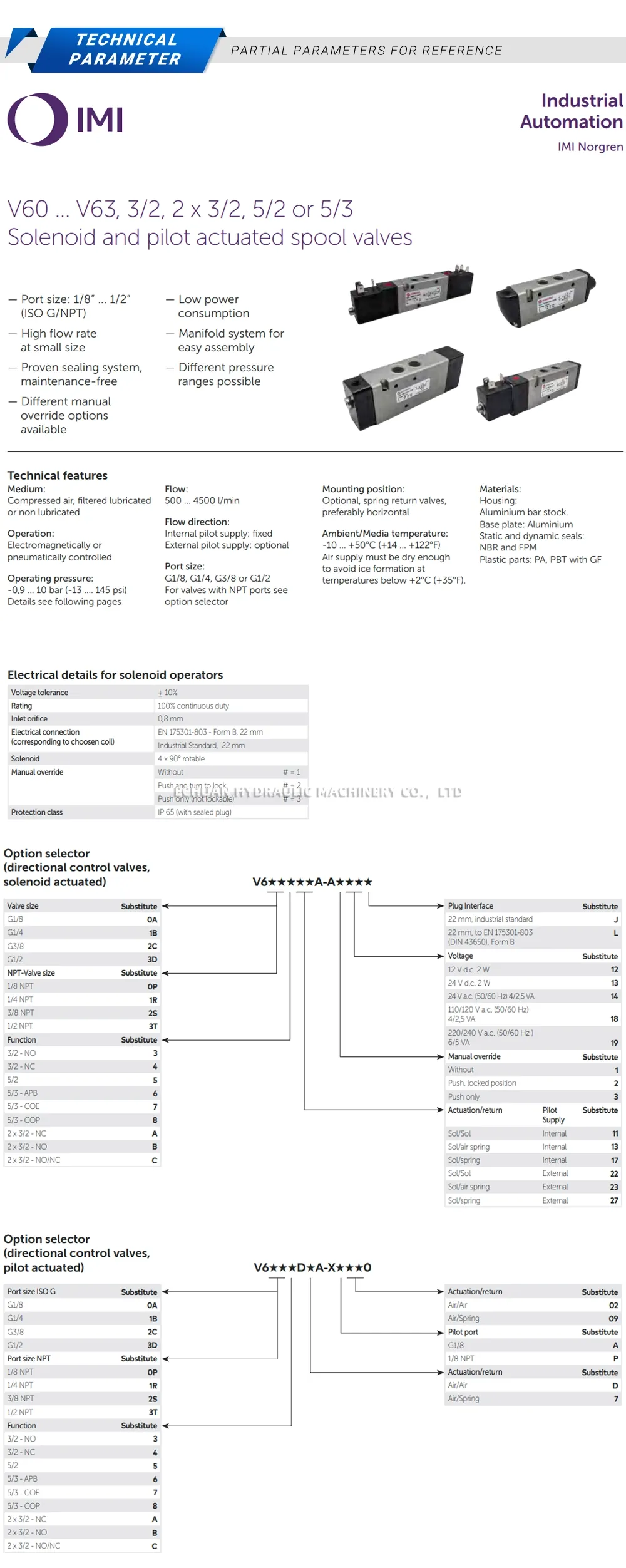 - Solenoid Features: LED indicator, electrical suppression (e.g., varistor)