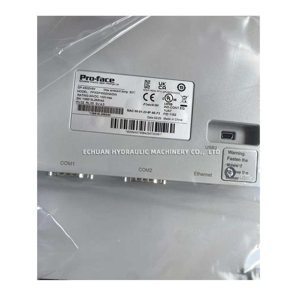 The Proface PFXGP4502WADW is a high-performance Human Machine Interface (HMI) from the GP4000W Series, designed to enhance operator control and monitoring in industrial automation environments. Featuring a vibrant 10.1-inch widescreen TFT color LCD with a resolution of 800 x 480 pixels, this touch panel provides clear and intuitive visualization of machine processes. It is equipped with a variety of communication ports, including Ethernet, RS-232C/422/485, and USB, ensuring seamless connectivity with a wide range of PLCs and other industrial devices. The robust design, with an IP65F-rated front panel, makes it suitable for demanding industrial conditions. With its ample memory and powerful processing capabilities, the PFXGP4502WADW is an ideal solution for complex applications requiring reliable and user-friendly control.
