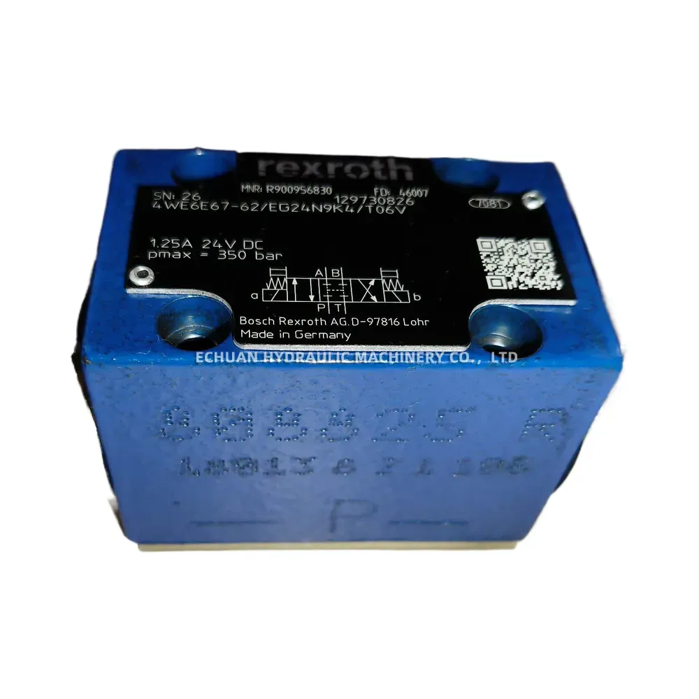 Genuine Bosch Rexroth 4WE6E67-62/EG24N9K4/T06V (R900956830) solenoid directional valve. This NG6, 24V DC hydraulic valve operates up to 350 bar, ensuring precise and reliable flow control for industrial hydraulic systems.