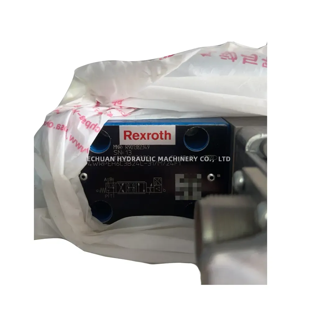 Genuine Rexroth 4WRPEH6C3B24L-3X/M/24F1 (R901382349) high-response proportional directional valve, size 6 (NG6). Features integrated electronics (OBE), 24VDC operation, and +/-10V command signal for precise hydraulic flow control.