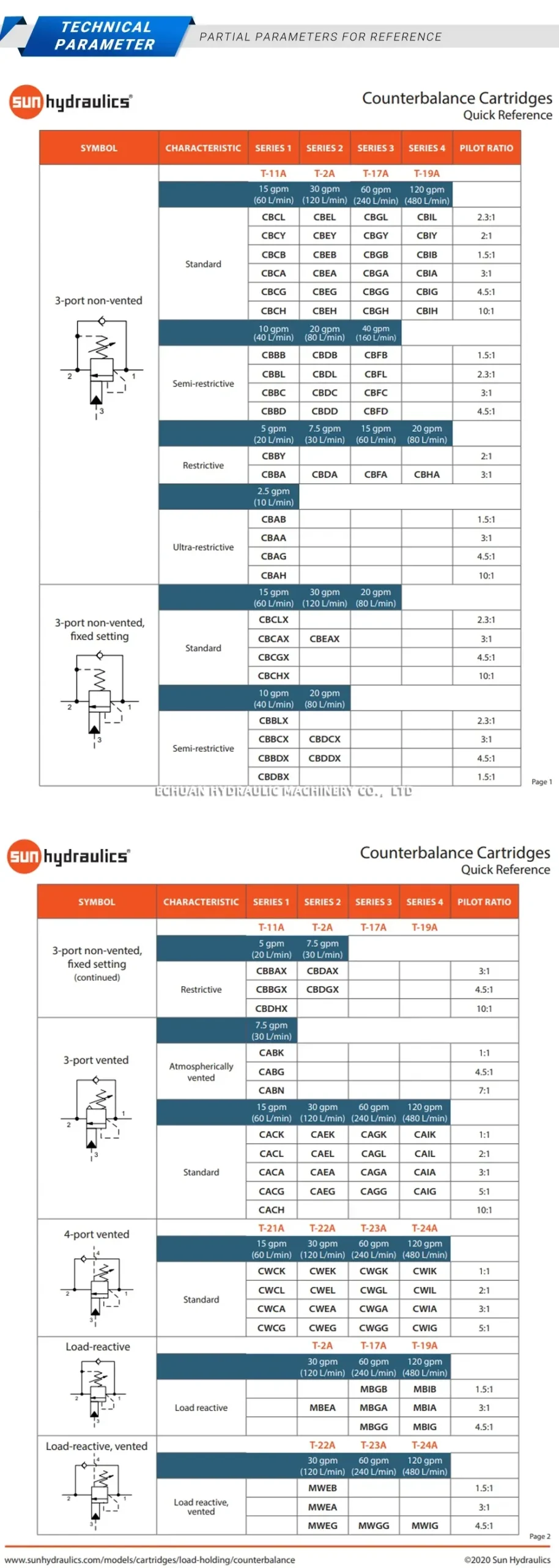 The SUN CBDA-LHN is a high-performance, pilot-assisted counterbalance valve with a balanced poppet design. It is primarily used to control overrunning loads by restricting fluid flow from an actuator (port 1) while allowing free flow in the opposite direction (from port 2 to port 1). The pilot-assisted feature allows for smooth and controlled motion, as pressure at the pilot port (port 3) reduces the valve’s setting. Its balanced construction ensures that the valve’s setting is minimally affected by back-pressure at port 2. This cartridge valve is designed for insertion into a T-11A cavity and is ideal for load-holding, safety, and thermal relief applications in mobile and industrial hydraulic systems.