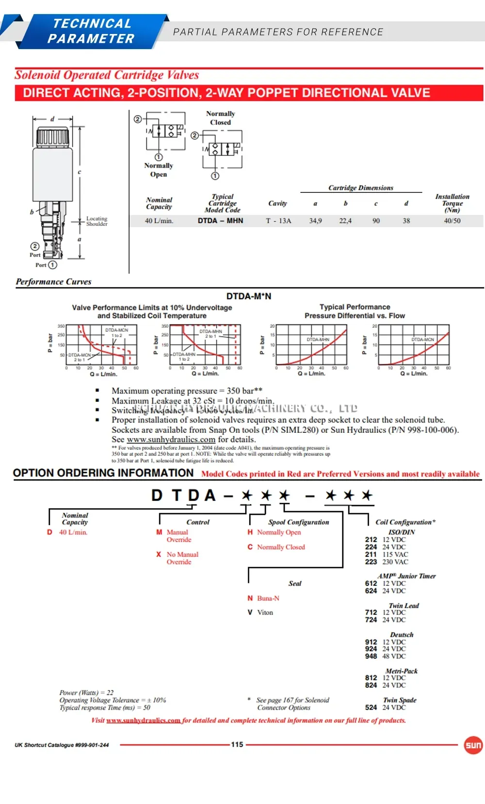 The SUN DTDA-MCN is a pilot-to-open check valve with a pilot-assist feature, commonly referred to as a counterbalance valve. It is designed to control overrunning loads by allowing free flow from the directional valve (port 2) to the load (port 1), while blocking flow in the opposite direction until sufficient pilot pressure is applied at port 3. This screw-in, cartridge-style valve provides smooth, stable, and reliable load control in demanding hydraulic applications, preventing load runaway and cavitation. Its primary function is to lock a load in position and control its motion when pressure is applied. The DTDA-MCN fits into a standard T-11A cavity, making it a versatile component for integration into custom hydraulic manifolds.