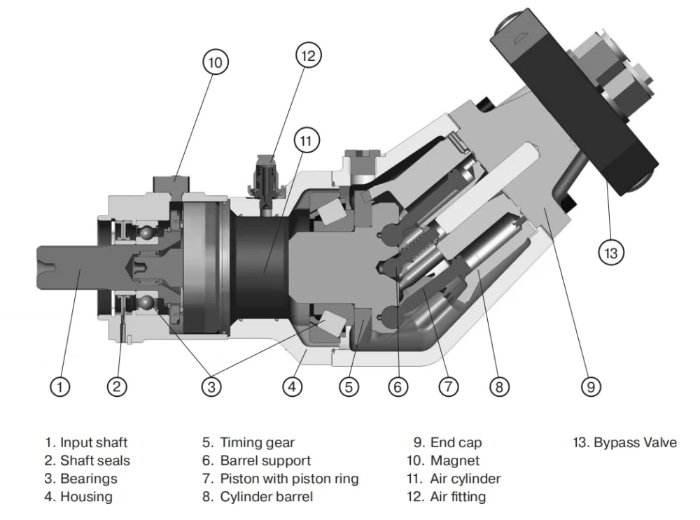 As shown in the diagram, this pump has another unique design: a pneumatically controlled cylinder structure is integrated in the middle of the pump, between the input shaft and the rotating assembly. Only about 5 to 10 bar of pneumatic pressure is needed to move the pneumatic cylinder. The pump’s separation is achieved through a pneumatic switch.