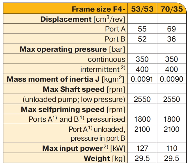 (2) It’s a separable pump. What does it separate? Why separate it? How? First, let’s give a basic introduction to this F4 series separable dual-flow pump: It’s a bent-shaft type axial piston fixed-displacement pump with a maximum working pressure of 400 bar. It has two different displacement specifications: 55/52 and 70/36 cm³/rev. (We’ll explain why there are two displacement values ​​later.) The 70/36 model has a maximum flow rate of 125/65 L/min. It uses standard hydraulic oil with a minimum fluid temperature of -40°C and a maximum temperature of 115°C. This pump weighs approximately 29.5 kg and has a maximum operating speed of 2550 rpm. The basic parameters are as follows: