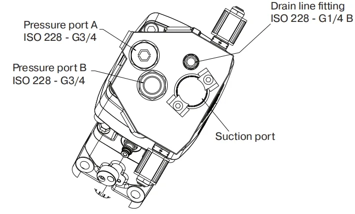 The image below shows the external shape of the F4 pump. Its inlet and outlet are axial ports, both located on the rear end face of the rear cover. The ports are distributed as one suction port but two outlet ports, port A and port B. This is different from most pumps on the market. Other pumps, whether gear pumps, vane pumps, or piston pumps, mostly have one inlet and one outlet. This pump, however, has two outlet ports. This is likely a design specifically for the unique needs of truck hydraulic systems. Furthermore, the displacement of these two ports is different. How is this achieved?