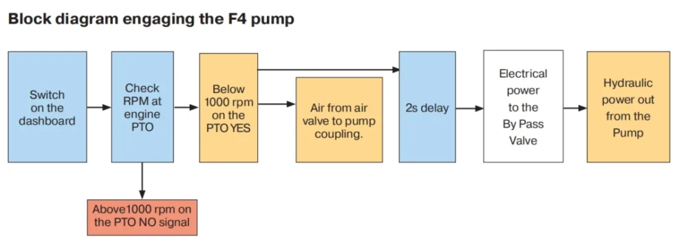 The official promotional materials state that the F4 series pump integrates a coupler, enabling dynamic engagement and disengagement of the pump. By pressing a button on the dashboard, the pump can be engaged or disengaged from the diesel engine without shutting it off.
